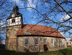 In der im Mittelalter errichtete Dorfkirche haben sich aus dieser Zeit im Kirchturm noch Teile und in die Ostwand und der Chorbogen erhalten. In den Jahren 1732 bis 1734 wurde die Kirche im Stil der Zeit unter Einbeziehung der Reste der Vorgängerin erbaut. Die Zuckerhutglocke aus dem 12. Jahrhundert und eine reich verzierte Glocke von 1628 und die barocke Innenausstattung mit dem reich geschmückten Kanzelaltar sind kunsthistorisch bemerkenswert.[1]