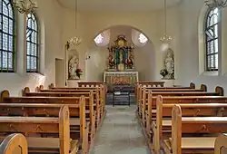 Das Innere ist mit einer flachen Decke eingezogen. Über dem Eingang befindet sich eine kleine Empore. Langhaus und Chor stehen durch einen rundbogigen Triumphbogen in Verbindung, in dessen Nischen rechts eine Josefsstatue mit Zimmermannswinkel (130 Zentimeter hoch) und links eine Anna selbstdritt (110 Zentimeter hoch) aufgestellt sind. Im Chor steht ein wertvoller Rokokoaltar von Mitte des 18. Jahrhunderts. Dieser wurde wohl vom Schönauer Schnitzer Franz Joseph Beckert von einem ursprünglichen Barockaltar umgearbeitet.[1] Der Altar enthält drei Figuren: in der Mitte steht über einem blauen Baldachin Maria mit Jesuskind (85 Zentimeter hoch), seitlich dazu sind die Figuren vom heiligen Nikolaus und Wendelin (je 55 Zentimeter hoch) aufgestellt.