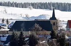 Der spätbarocke Kirchenbau besitzt einen rechteckigen, an den Ecken abgerundeten Grundriss mit nach Osten gerichtetem Altarraum. An der Südseite schließt sich in der Ecke zwischen Kirchenschiff und Altarraum ebenerdig die rechteckige Sakristei an. Das Mauerwerk besteht aus Bruchsteinen, die Dächer sind als Walmdächer ausgeführt und mit blecherner Dachhaut bekleidet. Am Ende des Dachfirstes befindet sich ein zweiarmiges Kreuz.