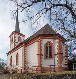 Die Saalkirche wurde 1608 unter Einbeziehung älterer Bauteile errichtet. Sie hat einen eingezogenen, dreiseitig geschlossenen Chor im Osten, dessen Wände von Strebepfeilern gestützt werden, und den quadratischen Kirchturm im Westen des Langhauses, der mit einem achtseitigen, schiefergedeckten, spitzen Helm bedeckt ist. In seinem Glockenstuhl hängen drei Kirchenglocken. Sowohl die Wände des Langhauses als auch die des Chorschlusses haben Maßwerkfenster. Der Innenraum des Chors ist mit einem Tonnengewölbe überspannt. Im Mittelpunkt steht der 1720 entstandene Altar mit dem großen Kruzifix. Auf dem Schalldeckel über der steinernen Kanzel ist die Taube dargestellt. Die Orgel wurde 1921 von G. F. Steinmeyer & Co. gebaut.
