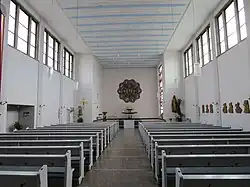 Das Innere ist weiß gefasst. Die Ausstattung ist überwiegend bauzeitlich. Erwähnenswert sind das Rundmosaik der Altarwand und das große Buntglasfenster auf der Westseite des Altarraums. Über dem Portal ist außen eine Darstellung der hl. Anna, die im Buch der heiligen Schriften Israels liest und gleichzeitig mit der Hand auf Maria mit dem Jesuskind weist.
