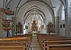 Der Chor besteht aus zwei Jochen und einem Fünfachtelschluss. Er ist mit Kreuzrippengewölben geschlossen, die auf teils mit Masken verzierten Konsolen ruhen. Das erheblich breitere Schiff aus drei Jochen wurde erst nach 1603 erbaut. Das Tonnengewölbe ruht auf kräftigen Wandpfeilern mit gekehlten Kämpfern und ist mit Rippen in einfacher Rautenfigur versehen. Die massive Westempore entstammt der Barockzeit.