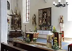 Der Hochaltar ist ein bemerkenswerter spätgotischer Flügelaltar aus der Zeit um 1490. Er hat einen rechteckigen Schrein mit Rankenschnitzereien Im Schrein befindet sich eine gotische Kreuzigungsgruppe, bestehend aus dem Gekreuzigten, sowie aus Maria und Johannes unter dem Kreuz und drei Engeln, die das Blut des Gekreuzigten auffangen. Diese Kreuzigungsgruppe folgt dem um 1480 entstandenen Kupferstich von Martin Schongauer. Die bemalten Flügel zeigen in geschlossenem Zustand die acht Heiligen Georg, Vitus, Sebastian, Mauritius sowie Florian, Ägidius, Leonhard und Achatius. In geöffnetem Zustand sind vier Szenen der Passion Christi: Christus vor Pilatus, Dornenkrönung, Geißelung und Ecce Homo zu sehen. An der bemalten Predella sind links und rechtes Wappen der Familie Rogendorf zu sehen; auf den Tabernakeltüren außen Maria und Johannes, innen Maria Magdalena und Maria Salome.
