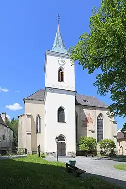 Der rechteckige Bau ist von einem Doppelwalmdach gedeckt. Sein umlaufender Sockel ist im Osten gestuft, im Westen sehr hoch und springt in den Burggraben ein. Das Äußere ist durch Strebepfeiler und zwei-, drei- und fünfbahnige Spitzbogenfenster mit Vierpass- und Fischblasenmaßwerk gegliedert. Vom westlichen Rechteckportal führt eine gemauerte Verbindungsbrücke über den Graben zum Schloss. Früher gab es außerdem eine Holzbrücke zur Empore. Der neugotische, zweigeschoßige Südturm mit Spitzbogenfenstern wurde 1810 erbaut, hat im Obergeschoß eine spitzbogige Blendbalustrade sowie zweibahnige Schallfenster mit hölzernem Maßwerk und wird von einem Zeltdach bekrönt. Im Norden liegt ein pultgedeckter zweigeschoßiger Sakristeianbau aus der Zeit um 1480 mit vergitterten Rechteckfenstern und im Nordwesten ein ebenerdiger Anbau mit Pultdach aus dem dritten Viertel des 20. Jahrhunderts. An der Südwand wurde 1964 eine Wandmalerei hl. Christophorus vom Anfang des 16. Jahrhunderts freigelegt. Seitlich sind zwei Wappen (Rogendorf und Liechtenstein) zu sehen. In der Eingangshalle im Turmerdgeschoß befindet sich ein schulterbogiges Portal mit durchkreuzter Stabrahmung aus der Zeit um 1480.