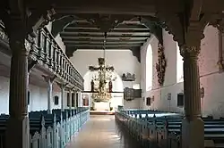 Die Holzbalkendecke des Kirchenschiffs wurde 1742 zwischen den Balken mit neutestamentlichen Szenen in 36 Medaillons ausgemalt.[11] Die Medaillons waren ursprünglich von einem Rankenmuster umgeben, das jedoch nur bei einem Bild wieder freigelegt ist.[12]