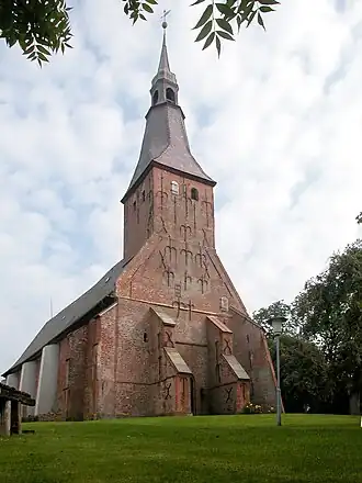 Die spätgotische Saalkirche aus Backsteinen wurde um 1400 errichtet. Sie besteht aus einem Langhaus und einem gleich breiten Chor mit Fünfachtelschluss von 1558, der 1657 vergrößert wurde.[4] Die Nordwand ist fensterlos. Das Dach ist mit Schieferschindeln gedeckt.