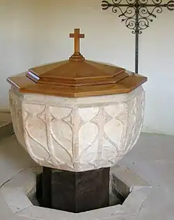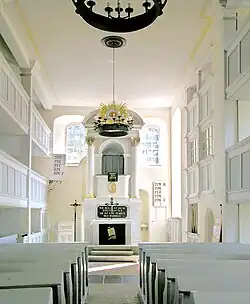 Im Innern ist die Kirche als schlichter flachgedeckter Saal mit Emporen an drei Seiten ausgebildet. Ein rustikaler hölzerner Kanzelaltar vermutlich aus dem Jahr 1823 bildet das Hauptstück der Ausstattung. Ein großer Taufstein mit achteckiger Kuppa und Maßwerkornament stammt aus der Zeit um 1500.