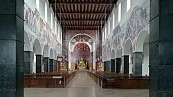 Im Inneren fällt neben den zahlreichen Gemälden die Christusdarstellung in der Apsis ins Auge. Sie wurde geschaffen vom Regensburger Künstler Georg Winkler, der in Zusammenarbeit mit Geistlichen und mit dem in Regensburg ansässigen Holzbildhauer Guido Martini das künstlerische Gesamtkonzept der Kirche und die Entwürfe für den Hochaltar und die Buntglasfenster erstellte. Winkler erschuf von 1928 bis 1938 die Fresken als Mineralmalereien, deren Bilderfolgen zwar traditionell gestaltet sind, jedoch durch Verbindungen mit zeitgenössischen Darstellungen auch ganz eigene Akzente haben. Der Hochaltar wurde von Haber & Brandner gefertigt, die Bildhauerarbeiten wurden von Guido Martini gestaltet. Die Glasmalereien stammten von den beiden Regensburger Firmen Schwarzmeyer und Schneider. Die Buntglasfenster sind nicht erhalten. Sie wurden Opfer eines Bombenangriffs am Ende des Zweiten Weltkriegs.