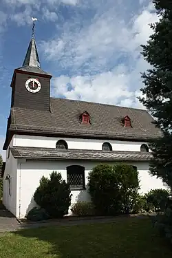 Der aus verputztem Bruchstein errichtete Saalbau hat einen dreiseitigen Chorschluss. Die Kirche wurde 1931 östlich erweitert und im Chorscheitel eine Sakristei angebaut. Eine weitere Vergrößerung erfolgte 1948/49.