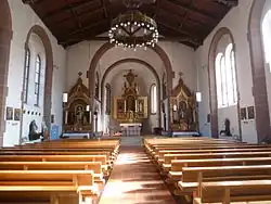 Jederseits erleuchten acht zu Paaren gekoppelte Rundbogenfenster das einschiffige Langhaus, außerdem das westliche Rosettenfenster, das ein Glasgemälde der heiligen Cäcilia von Rom, umgeben von Engeln mit Musikinstrumenten, füllt. Jedes Fensterpaar wird im Inneren von einem runden Blendbogen überfangen. Der Dachstuhl des Langhauses ist offen, das gesamte Gebälk, auch die Dachneigung, sichtbar, die Bretter braun gebeizt, die Balken bemalt. Ein gerundeter Triumphbogen führt in den Chor. Dessen 1931 von Franz Schilling (1879–1964) ausgeführte „byzantinisch anmutende Malerei“[13] ist heute, wohl seit der 1973er Renovierung, übertüncht.