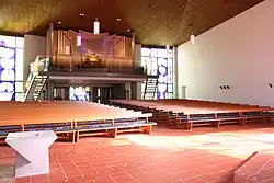 Das Instrument besitzt drei Manuale samt Pedal und ist auf die „französisch geprägte symphonisch-romantische Klangwelt ausgerichtet.“[15] Mit diesem Konzept unterscheidet sich die Orgel von den in der Region Zürich oft erbauten „Universalorgeln“ und auch von der 2014 neu erbauten Edskes-Orgel in der Nachbarpfarrei Maria Frieden Dübendorf, welche eine Prägung in der Tradition Arp Schnitgers aufweist. Die Orgel in Wallisellen besitzt 32 Register (davon zwei Transmissionen). Von den 2004 Pfeifen bestehen 1920 aus einer Zinn/Blei-Legierung, 84 Pfeifen sind aus Holz gebaut. Die Traktur ist mechanisch, die Registratur mechanisch und verfügt über eine zusätzliche elektronische Setzeranlage (Doppelregistratur). Eine Besonderheit sind die fächerförmig angeordneten Prospektpfeifen. Diese Anordnung orientiert sich an der Architektur der Kirche. So nimmt der Orgelprospekt die Gestaltung der Chorwand auf, die dem Corpus Christi folgt. Mittels Beleuchtung kann der Orgelprospekt in den liturgischen Farben beleuchtet werden.[16] Die Disposition lautet:[17]