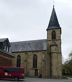 Die neugotische Saalkirche aus hammerrechten Bruchsteinen wurde 1897/98 erbaut. Sie besteht aus einem mit einem Satteldach bedeckten Langhaus von drei Jochen, dessen Außenwände von Strebepfeilern gestützt werden, zwischen denen sich Maßwerkfenster befinden, einem eingezogenen Chor mit Fünfachtelschluss im Osten, vor dem quer die Sakristei liegt, und einem Kirchturm auf quadratischem Grundriss im Westen, der mit einem Pyramidendach bedeckt ist, in dessen Dachgauben sich die Zifferblätter der Turmuhr befinden. An den Kirchturm schmiegt sich im Norden ein Treppenturm an. Über dem Portal an der Westwand des Kirchturms steht die Statue des heiligen Antonius.