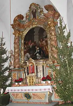 - Das Gemälde in einem holzgeschnitzten Rahmen von 1680 im neubarocken Hochaltar von 1934 zeigt die Darbringung im Tempel, es ist Johann Georg Rudolphi zugeschrieben.