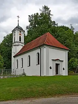 Das im Osten dreiseitig geschlossene Langhaus wurde 1709 gebaut. Daran wurde um 1760 der Kirchturm im Osten angeschlossen, der dem Vater von Jakob Eberle zugeschrieben wird. Sein oberstes, mit Pilastern an den Ecken versehenes Obergeschoss beherbergt die Turmuhr und den Glockenstuhl. Darauf wurde 1791 eine Glockenhaube gesetzt. Die Saalkirche wurde 1791 nach einem Entwurf von Thaddäus Rieff völlig umgestaltet. Zur Kirchenausstattung gehört ein um 1680 gebauter Hochaltar, der von den Statuen des Rochus von Montpellier und des heiligen Sebastian flankiert wird. An der Brüstung der Empore sind die zwölf Apostel dargestellt.