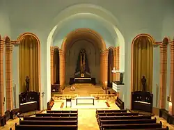 Das Hauptschiff der Kirche ist ein weiter Saal mit Kuppelgewölbe und Nischen mit Seitenaltären (vorne) bzw. Beichtstühlen (hinten) in den abgeschrägten Ecken. In der Mitte der Kuppel sorgt ein Oberlicht für ausreichende Helligkeit in allen Teilen der Kirche. Der rechteckige und tonnengewölbte Altarraum ist in zwei Absätzen über sechs und vier Stufen erreichbar, ein tonnengewölbtes Zwischenjoch verbindet harmonisch den Chorbereich mit dem Kirchenschiff. Beidseitig im Chorraum angeordnete Säulen bilden diesen Raum zur Dreischiffigkeit aus. Jede Seite verfügt über ein Altarfenster. Die markante Dreischiffigkeit des Chorbereichs von St. Augustinus hatte wohl ihr architektonisches Vorbild in der in den Jahren 1923–1924 errichteten Michaelskirche des Architekten Hans Herkommer in Saarbrücken-St. Johann (siehe Vergleichsbild).