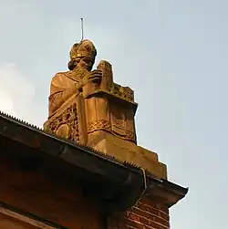 An den Ecken der Giebelfront befinden sich zwei aus Stein gehauene Bischofsfiguren: