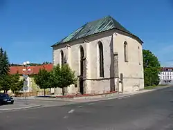 Die gotische Einstützenkirche von 60 Fuß Länge und 30 Fuß Breite mit stumpf abgewinkeltem Ostabschluss, von einer Familie von Asch gestiftet und von den Kreuzherren mit dem Roten Stern erbaut, grenzte ursprünglich direkt an den inneren Brucktorturm. Der Haupteingang, ein profiliertes Spitzbogenportal aus der Zeit um 1320 lag in der Mitte der Südwand (heute vermauert). Der heutige Eingang befindet sich im Westen von der Seite der Kommende, einem einstöckigen, schmucklosen Gebäude aus der Barockzeit, das direkt an die Kirche anschließt. Die St.-Wenzels-Kapelle, 1347 von Niklas Walther von Hof gestiftet, mit südlichem Anschluss an die St.-Bartholomäus-Kirche erbaut, wurde 1945 nach Beschädigungen abgerissen.