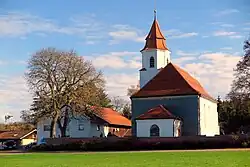 Die um 1500 erbaute Saalkirche besteht aus einem Langhaus, einem eingezogenen, dreiseitig geschlossenen Chor im Osten, einem Chorflankenturm an der Nordwand des Chors und einem Anbau, in dem sich das Portal befindet. Der Chorflankenturm wurde in der zweiten Hälfte des 18. Jahrhunderts mit einem achteckigen Geschoss, das den Glockenstuhl beherbergt, aufgestockt und mit einer gestuften Haube bedeckt.