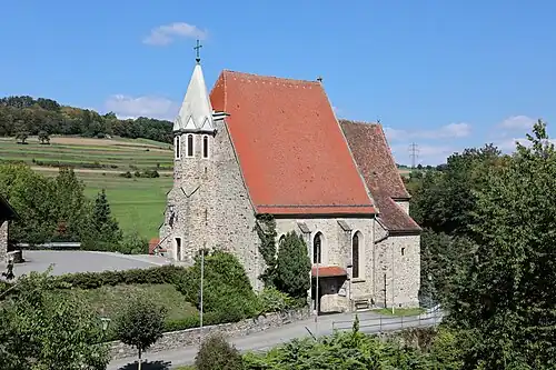Das Langhaus hat einen profilierten Sockel sowie ein hohes, steiles Dach mit Schopfwalm im Westen und Steinkreuz im Osten. Die Wände werden von Strebepfeilern mit Wasserschlägen gestützt. Zwei davon sind an der Südseite mit geschweiften Giebelverdachungen versehen. Die Spitzbogenfenster des Bauwerks verfügen teilweise über zweibahniges Maßwerk. Manche davon wurden 1797 vergrößert. Durch zwei Spitzbogenportale mit reich verstäbtem Gewände und seitlichen Steinbänken vom ist die Kirche zugänglich. Über dem südlichen Portal ist eine reliefierte Steinrosette zu sehen. Der eingezogene Chor mit hohem profiliertem Sockel und niedrigem Halbwalmdach stammt aus der Zeit um 1500. Der vorgestellte Westturm aus dem ersten Viertel des 16. Jahrhunderts hat ein achteckiges Glockengeschoß, einen gemauerten Pyramidenhelm mit Giebelkranz, schmale Schlitzfenster und rundbogige Schallfenster. An der Südseite des Chores befindet sich außerdem ein zweigeschoßiger Sakristeianbau aus der Zeit um 1500.