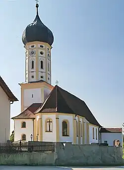 Der eingezogene, dreiseitig geschlossene, von Strebepfeilern gestützte gotische Chor im Osten des barocken Langhauses und das Erdgeschoss des Chorflankenturms auf quadratischem Grundriss an der Südwand des Chors wurden um 1484 errichtet. Die oberen Geschosse des Chorflankenturms, die den Glockenstuhl und die Turmuhr enthalten, und die Zwiebelhaube wurden 1680/81 aufgesetzt.
