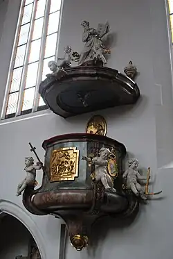 Zunächst war die Kanzel an der linken Seite des Chorbogens befestigt und ist gegenwärtig an der südlichen Langhauswand angebracht. Der Korpus ist mit drei Putten verziert, die mit dem Kreuz, einem Kelch und einem Anker ausgestattet sind. Sie symbolisieren die göttlichen Tugenden Glaube, Hoffnung und Liebe. Ein Relief an der Vorderseite zeigt die Anbetung der Hirten. Eine Büste des jugendlichen Evangelisten Johannes ist rechts in der Wandung eingelassen.