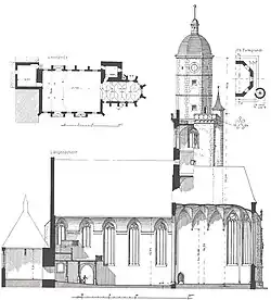 Die Saalkirche ist geostet und hat einen polygonalen Chor. Im Westen stößt die Nikolauskapelle direkt an das Gebäude. Insgesamt ist die Kirche auf drei Seiten von Häusern umgeben und öffnet sich im Osten zur Hauptstraße hin.