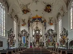 Die Bildmedaillons sind von Rokokodekor eingerahmt. Auch die oberen Leibungen der Fenster und die Kappen der Hohlkehlen sind verziert. Ein auf der Ostseite von stuckierten Vasen besetztes Gesims umläuft die Decke. Putten mit Blumengehängen sind farbig gefasst. Ein geraffter blauer Vorhang am Chorbogen aus Stuck trägt in seinem Scheitel ein barockes Kruzifix.[9]