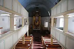Eine zweigeschossige Hufeisenempore umschließt das Kirchenschiff. Die Holzdecke ist tonnenartig geformt. Im Chor sowie in der Patronatsloge gibt es stark verzierte Buntglasfenster.