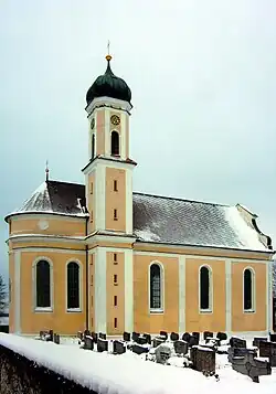 Die Kirche ist dem Heiligen und Bischof Blasius von Sebaste geweiht. Sie hat ein einschiffiges Langhaus mit eingezogenem Chor. Die Außenfigur in der Chorbogennische ist eine Blasiusdarstellung von Johann Georg Reisch aus dem Jahre 1725.