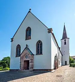 Der Hauptweg auf dem ummauerten Kirchplatz führt genau von Westen auf die geostete Kirche zu. Er trifft dabei zunächst auf einen sechseckigen gedeckten Umgang, über dessen rechter, südlicher Ecke sich der freistehende Turm mit Satteldach erhebt. Er nimmt „Formen der traditionellen Markgräfler Kirchtürme auf“ – eine Rückkehr zu geschlossen-massiver Bauweise „nach den vielen aufgelösten Formen der Nachkriegskirchen“.[8] Der Hauptweg endet am Portal der Kirche, deren Grundriss dem Umgang ähnelt und die mit einem steilen Walmdach das Gemeindezentrum dominiert.
