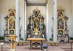 Den neuen Zelebrationsaltar, den Ambo, die „Taufstätte“ und den Osterleuchter gestaltete Kleiser so, dass sie „die Sprache der heutigen Zeit ausdrücken <...>, ohne aber im Widerspruch oder gar als Fremdkörper zu den Barockaltären zu stehen“.[14] Der hölzerne Zelebrationsaltar ist ein Tisch, auf dessen vier Füßen Brot und Wein dargestellt sind, während vier bronzene Rundscheiben das Abendmahl Jesu, die Mater dolorosa, die Überzeugung des ungläubigen Thomas (Joh 20,24-29 ) und die drei Frauen am leeren Grab (Mk 16,1-6 ) zeigen. Ein Bronzemedaillon am Ambo zeigt die Hand des Sämanns im Gleichnis vom vierfachen Ackerfeld.