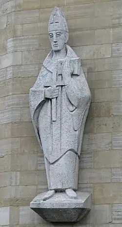 An der rechten Ecke wurde 1960 eine Bonifatiusstatue von Gisela Bär angebracht. Über dem Hauptportal befindet sich ein großes Drillingsfenster, flankiert von zwei Engeln und bekrönt vom Lebensbaum. Darüber endet die Fassade mit einer Darstellung des Auge Gottes und einem steinernen Kreuz.