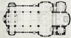 Das äußere Erscheinungsbild der mit gelbem Sandstein verkleideten Kirche ist geprägt von konkav vorstoßenden Mauern und den geschwungenen Dächern. Die Fassade ist nur spärlich geschmückt. An der Hauptschauseite im Westen befinden sich drei hervortretende Eingangsportale mit an den Enden geschweiften Dreiecksgiebeln und – von links nach rechts – den goldgeletterten Inschriften: