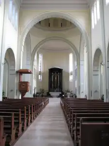 Der Innenraum ist mit kassettierten Arkaden in drei Schiffe unterteilt. Den Hochaltar aus schwarzem Kunstmarmor mit der Kreuzigungsgruppe, der umstellt ist von einem Baldachin mit sechs Säulen, schuf 1931 der Bildhauer Emil Sutor. Von ihm stammen auch die Figuren der Maria und des Franziskus an den Seitenaltären, der Kreuzweg und die Antoniusgruppe aus dem Jahr 1932. Den Zelebrationsaltar aus Granit, den Ambo und die Apostelkreuze schuf 1975 Gisela Bär. Bei der Sanierung der Kirche 2006/07 wurden die Bänke in den Seitenschiffen entfernt und die im Mittelschiff aufgearbeitet. Die Kanzel wurde von ihrem weißen Anstrich befreit.[3]