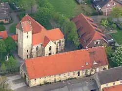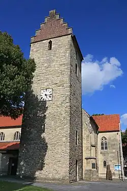 Der ungegliederte Westturm aus hellem Bruchsteinmauerwerk auf quadratischem Grundriss stammt aus dem 12. Jahrhundert. Unterhalb der Traufe sind an jeder Seite Schalllöcher mit Kleeblattbogen für das Geläut eingelassen. Die Glockenstube beherbergt ein Vierergeläut mit Glocken aus den Jahren 1926, 1949 und 1976.[3] Abgesehen von zwei schmalen Schlitzfenstern ist die Westseite fensterlos, die Nord- und Südseite haben Rundbogenfenster. Die Turmkapelle im Erdgeschoss wird im Süden durch ein Rundbogenportal erschlossen. Die Gewölbe in den beiden Untergeschossen wurden nachträglich eingezogen. Eine Rundbogenarkade öffnet die Turmhalle zum Langhaus. Ursprünglich war auch das zweite Geschoss auf diese Weise geöffnet.[1] Die Staffelgiebel im Norden und Seiten wurden in der Renaissance aus roten Backsteinen aufgeführt.