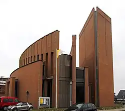 Das Kirchengebäude ist aus vier halbovalen Backstein-Schalen geformt, von denen die äußeren halbhoch und mit einzelnen Bullaugenfenstern versehen, die inneren im oberen Teil mit Langfenstern, im unteren mit Pfeilerdurchgängen durchbrochen sind, so dass sich außen der Eindruck eines zweigeschossigen Schiffsrumpfs – etwa einer Arche –, im Inneren der Dreischiffigkeit ergibt. Der Glockenturm mit dreieckigem Grundriss steht frei und ist seitlich aus der Achse des Kirchenschiffs versetzt.