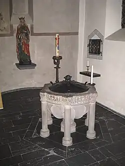 Zur Innenausstattung gehört ein Taufstein aus dem 13. Jahrhundert. Er steht in der südlichen Seitenschiffapside und ist aus Trachytgestein gefertigt. Dieses stammt wohl aus dem Siebengebirge. Das Becken wird von sechs Säulen getragen. Eine 85 cm hohe Pietà im gotischen Stil steht heute hinter dem Taufstein. Sie stammt aus dem 15. Jahrhundert und wurde aus Lindenholz geschnitzt.