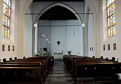 Für die einschiffige Kirche wurde sowohl im Langhaus als auch im Chor statt eines Deckengewölbes eine flache Holzdecke gewählt. Die auf Wandvorlagen ruhenden spitzbogigen Gurtbögen gliedern das Langhaus in drei Joche. Ein Gurtbogen markiert den Übergang des Kirchenschiffes in den durch zwei Stufen erhöhten Chorbereich.