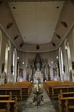 Die beiden Seitenaltäre, die in ihrer Gestaltung dem Hochaltar nachempfunden sind, sind der Mutter Jesu (östliche Seite) und dem hl. Joseph (westliche Seite) gewidmet. Der älteste Einrichtungsgegenstand der Kirche ist der sandsteinerne Taufstein von 1626 im Mittelgang, dessen Taufbecken von einer goldfarbenen Kuppel abgedeckt ist.