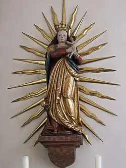 Der Hochaltar wurde 1956 neu errichtet. Die Rückwand des Hochaltars besteht aus einer schlichten schwarzen Granitplatte mit einem goldenen Dach. Im Giebel trägt eine runde goldene Tafel die Inschrift EINE LIEBE DIE RECHNET RECHNET SICH NICHT. Ein Rosenkranzbild aus dem Jahre 1697 ist golden gerahmt und zeigt zentral Maria mit dem Jesuskind, die den neben ihnen knienden Dominikus und Katharina von Siena Rosenkränze reichen. Unter ihnen ist das Fegefeuer zu sehen. Über den Personen sind kranzförmig 15 Medaillons mit den Gesetzen des freudenreichen, schmerzhaften und glorreichen Rosenkranzes angeordnet. Das Bild wurde 1697 von der Ortsherrschaft, den Herren von Ulm, zur Einführung der Rosenkranzbruderschaft gestiftet. Bei der Renovierung 1956 war es an die Südseite des Langhauses gehängt worden und kam 2001 an seinen ursprünglichen Platz zurück.