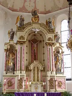 Der Hochaltar, wie auch die Seitenaltäre, stammen von 1877/1879 und wurden von Wilhelm Engel aus Babenhausen geschaffen. Die Deckenfresken in Chor und Langhaus stammen von 1740 und wurden im Zuge der Renovierung 1948/1949 wieder freigelegt. Im Chor ist die Flucht nach Ägypten und im Langhaus der Tod des heiligen Joseph dargestellt. Der Stuck mit Laub- und Bandelwerk sowie Gitterfeldern und Blütengehängen wurde auf Basis alter abgeschlagener Stuckreste während der Renovierung 1948/49 erneuert.