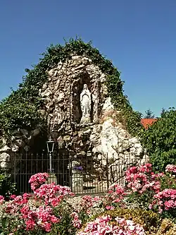 Die 1717 bis 1719 erbaute barocke Kirche hat einen achteckigen Kirchturm, der mit acht Gauben geschmückt ist. Der Barockaltar und zwei Seitenaltäre stammen teilweise noch aus dem 17. Jahrhundert, ein Kruzifix sogar aus der ersten Hälfte des 16. Jahrhunderts. Die Kanzel ist von 1748, die Orgel wurde gegen Ende des 17. Jahrhunderts gebaut.[6] Sie hat eine Sonnenuhr mit Rokokoverzierung. Neben der Kirche befindet sich eine Lourdesgrotte.