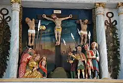 Der heutige Altaraufbau ist das Ergebnis einer Neuanfertigung von 1749. Jeweils zwei Säulenpaare stützen die einzelnen Geschosse der Schauarchitektur. Figürliche Teile eines aus Eichenholz geschnitzten spätgotischen Retabels aus der Mitte des 15. Jahrhunderts wurden diesem Rahmen eingefügt: 12 Apostelstatuetten verteilen sich auf die vier Geschosse, eine figurenreiche Kreuzigungsgruppe bildet das Mittelfeld. Bei der Restaurierung von 2004 behielt man die weiße Fassung der Barockzeit bei. Gleichzeitig wurde eine Reihe von gemalten Apostelköpfen hinter der zugenagelten Rückwand entdeckt, Teile vielleicht eines Altars aus dem ersten Viertel des Jahrhunderts, wie eine dendrochronologische Untersuchung ergab.