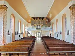 Ab dem Jahr 1976 wurde das Gotteshaus umfassend restauriert. Dabei wurden Umbaumaßnahmen vorgenommen, die die Kirchendecke betrafen. Das Holzgewölbe wurde durch eine barockisierende Flachdecke mit seitlicher Voutung und Kehlgesims ersetzt. Darüber hinaus wurde die baufällige Orgelempore abgerissen und eine neue Empore auf Marmorsäulen unter Verwendung der früheren Kommunionbank als Emporenbrüstung errichtet.[3] Für die Planung der Restaurierungs- und Umbauarbeiten war der Architekt Tibor Kugelmann (Saarbrücken)[4] verantwortlich. Die Ausführung der Arbeiten übernahm die Firma Fuchs (Würzburg). Im Jahr 2010 erfolgte eine Innenrestaurierung, bei der Feuchtigkeitseinträge in der Decke beseitigt wurden.[5][6]