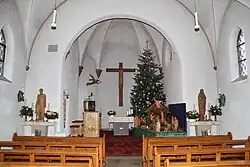 Aus der ersten Kapelle sind zwei hölzerne Statuen der Apostel Petrus und Paulus erhalten, die heute vor dem Turmpfeiler am Haupteingang stehen. Ebenfalls sind ein Kirchturmhahn mit der Jahreszahl 1658 und die kleinste der ehemals drei Glocken vorhanden. Diese hat die Inschrift SANCTA MARIA ORA PRO NOBIS ANNO MDCLV (Heilige Maria, bitte für uns! Im Jahre 1655) und befindet sich seit 1966 in der Friedhofskapelle.