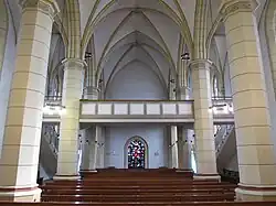 Das Kircheninnere ist durch hohe und weite spitzbogige Pfeilerarkaden gegliedert, die sich zu den schmaleren Seitenschiffen öffnen. Die schmucklosen Pfeiler sind in Schaft- und Kämpferzone achteckig gestaltet. Die Scheidbögen sind kräftig profiliert: eine Mittelrippe wird von Rundstäben flankiert. Die einzelnen Joche weisen eine sechsteilige Wölbung auf. Die Diagonalen werden durch vierteilige scharfkantige Birnstabrippen hervorgehoben. In der Mittelachse des Gewölbes stoßen die Kappen wie bei einer Spitztonne im Scheitel aufeinander. Rippen und Gurtbögen habenden den gleichen Querschnitt. In den Seitenschiffen nehmen schlanke Runddienste die Rippen und Gurtbögen auf. Die Fenstergewände der Querschiffe sind abgefast.
