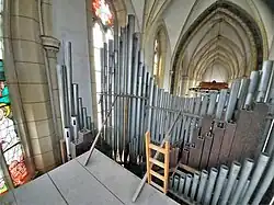 Im August 2023 wurde die Weise-Orgel im Rahmen einer Renovierungsmaßnahme abgebaut. Sie wird bis 2026 nach einer Dispositionsänderung und Erweiterung um drei Register durch die Firma Mayer auf die große Empore der Kirche umgesetzt.[16] Die bisherige sowie die zukünftige Disposition lauten wie folgt:[15]
