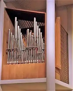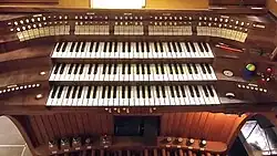 - Spielhilfen: 2 freie Kombinationen, 1 freie Pedalkombination, Tutti, Crescendowalze, Walze ab, Zungeneinzelabsteller