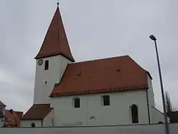 Die Kirche ist in etwa von Nordwesten nach Südosten ausgerichtet. Der Turm mit dem Chor im Erdgeschoss steht im Osten mittig zum Langhaus; dieses weist eine Flachdecke auf. An der Südseite des Langhauses sind vier leicht spitzbogig ausgeführte Fenster und das Portal zwischen der zweiten und dritten Fensterachse ausgebrochen; über dem Portal und im Osten der Südfassade befindet sich je ein kleines Rundfenster. An der Nordseite des Langhauses sind zwei kleinere Fenster in Emporenhöhe und ein größeres Fenster im Westen vorhanden. Unterhalb der beiden Emporenfenster zeigt sich mittig eine Rundbogennische. Die Sakristei ist an die Nordseite des Kirchturmes angebaut. An die Westfassade ist als kleiner Querbau ein Vorzeichen mit seitlichen Türen angefügt. Die Kirche besitzt eine Nord- und eine Westempore mit Treppenzugang von innen.