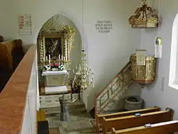 - Die barocke Kanzel in der Südostecke des Langhauses mit kleinen Engelsköpfen über den durch gewundenen Ecksäulchen voneinander getrennten Feldern des polygonen Korpus ist mit 1702 bezeichnet. Der Schalldeckel wird bekrönt von einer stilisierten Flammenvase.[7]